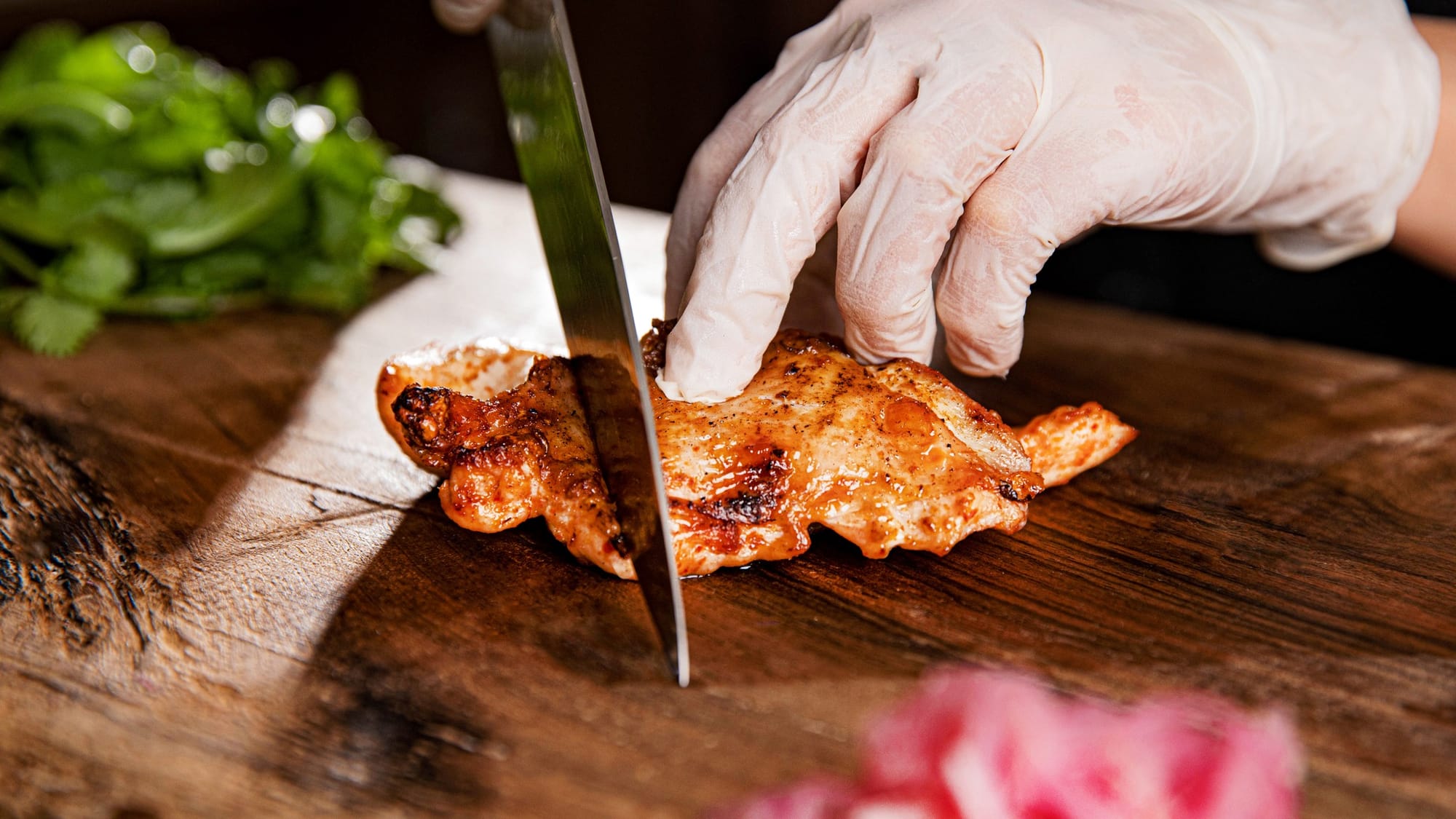 Tamtaki bread, grilled chicken with blackberry sauce, thinly sliced cucumber with kimchi sauce, onion marinade, radish, arugula, kondzi.
