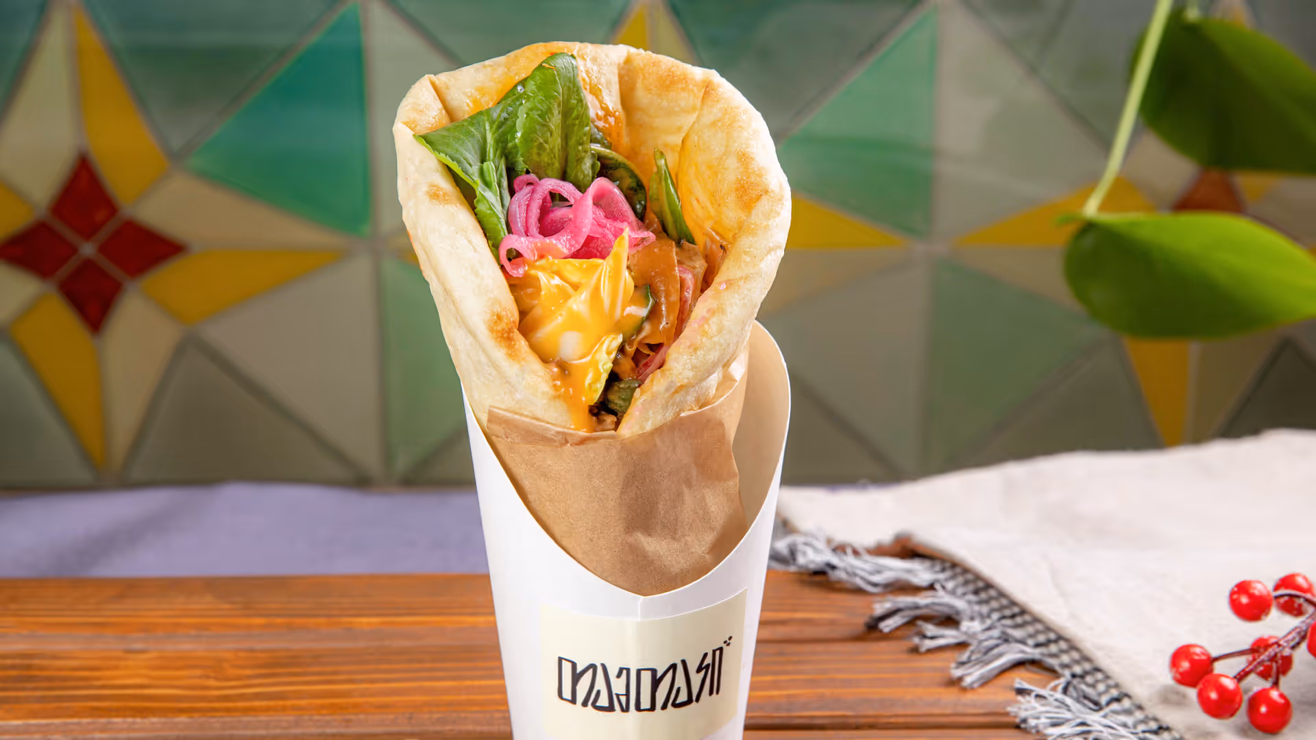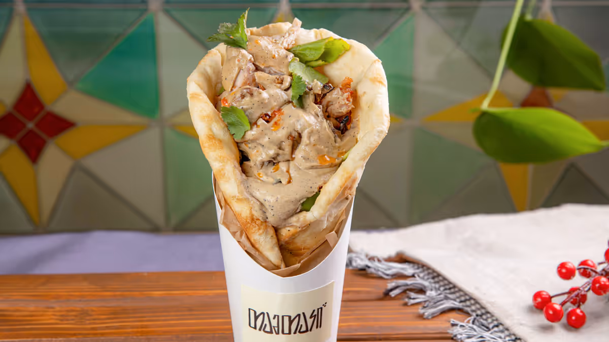 Grilled chicken fillet and scallions wrapped in tamtaki bread, grilled mushrooms, smoked garlic sauce, pickled onions, arugula, coriander, hot red pepper oil.