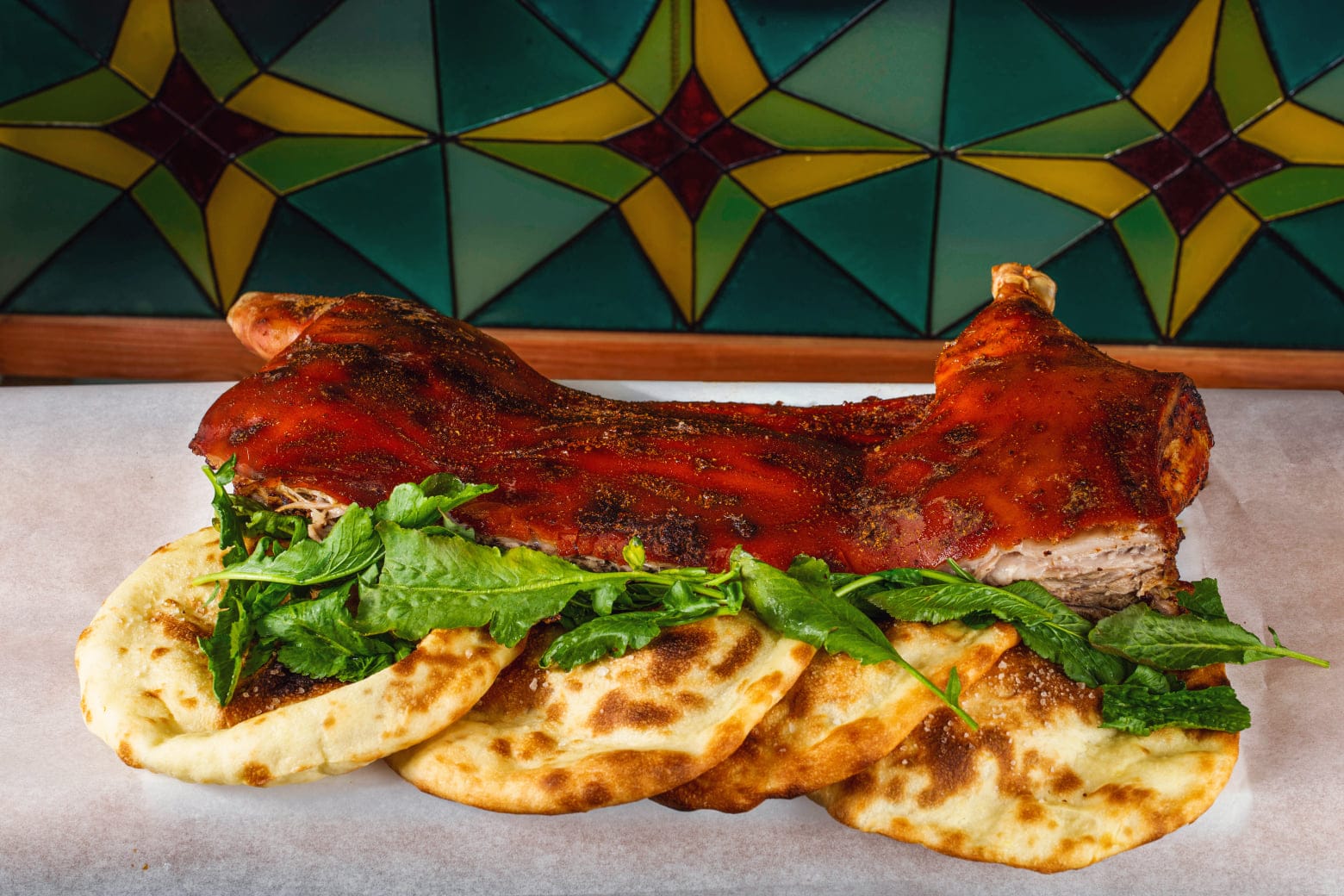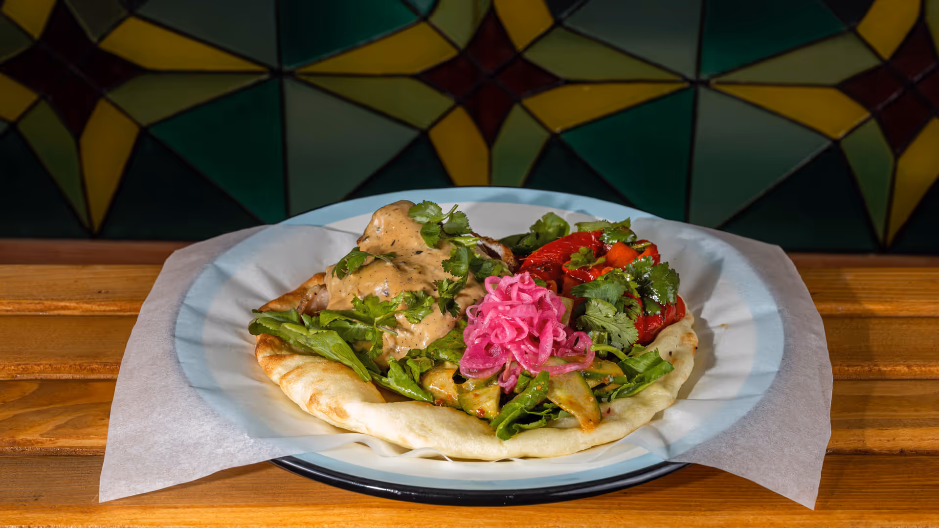 Tamtaki bread, grilled chicken, grilled mushrooms, smoked garlic sauce, pickled onions, arugula, coriander, hot red pepper oil.