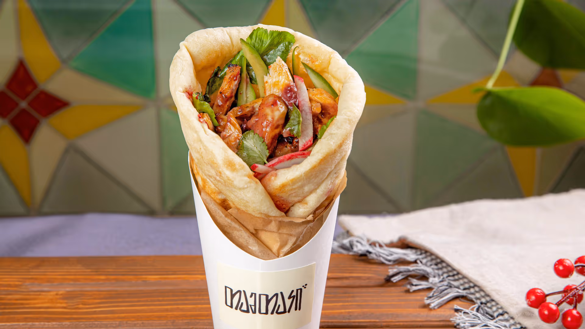 Grilled chicken breast and fillet wrapped in tamtaki bread, blackberry sauce, cucumber salad with slightly spicy sauce, pickled red onion, radish slices, arugula, coriander.