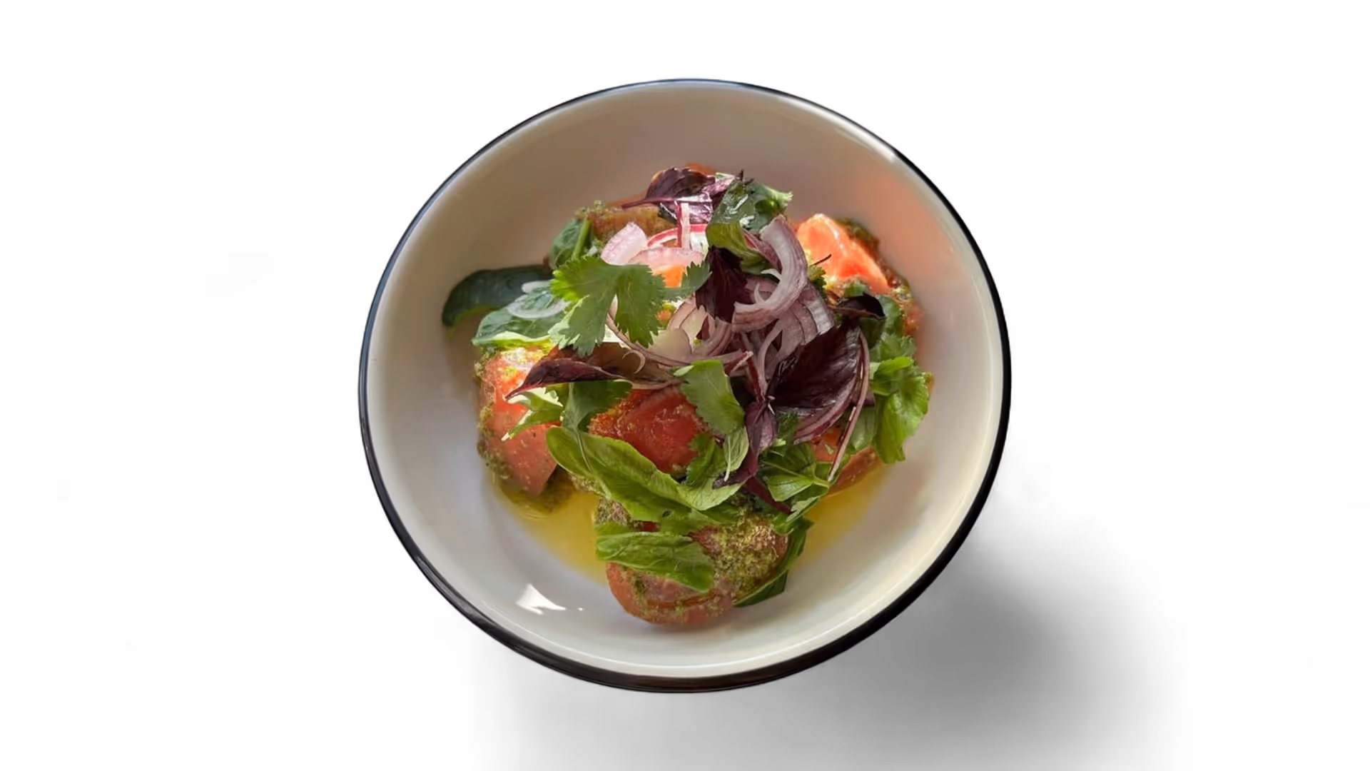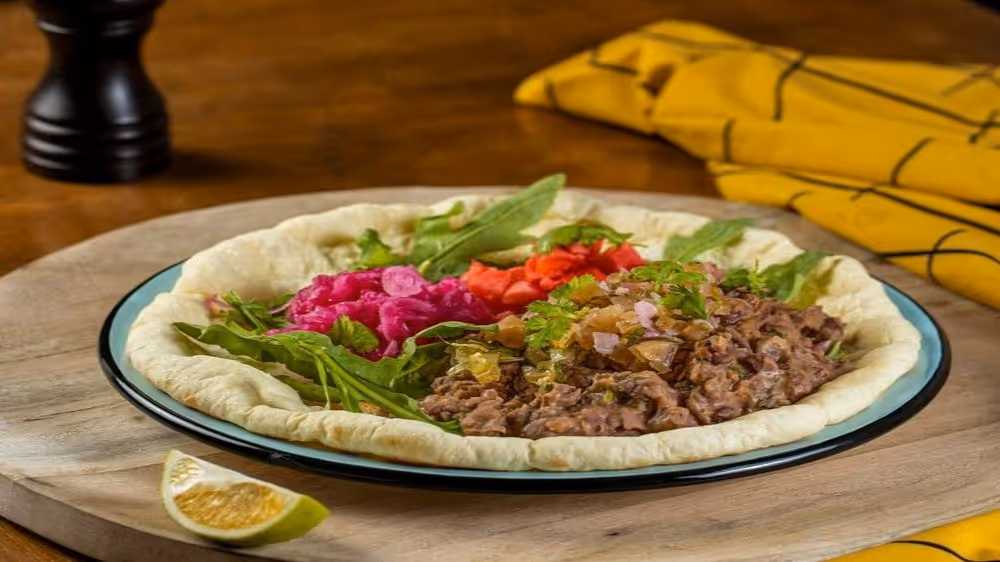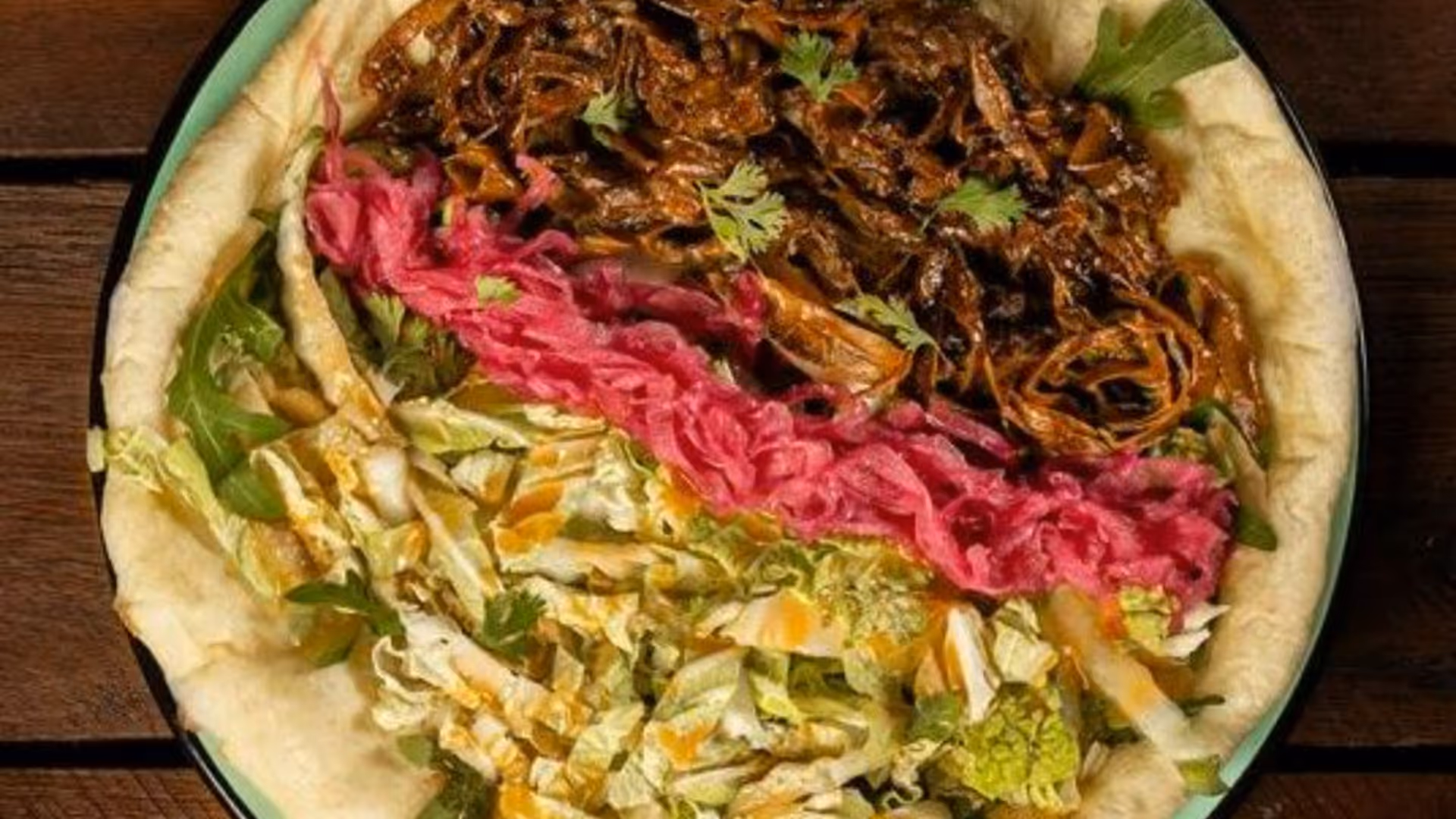 Tamtaki bread, slow-cooked grilled beef in a smoked and caramelized onion sauce, coleslaw with a light spicy sauce, arugula, coriander, onion marinade