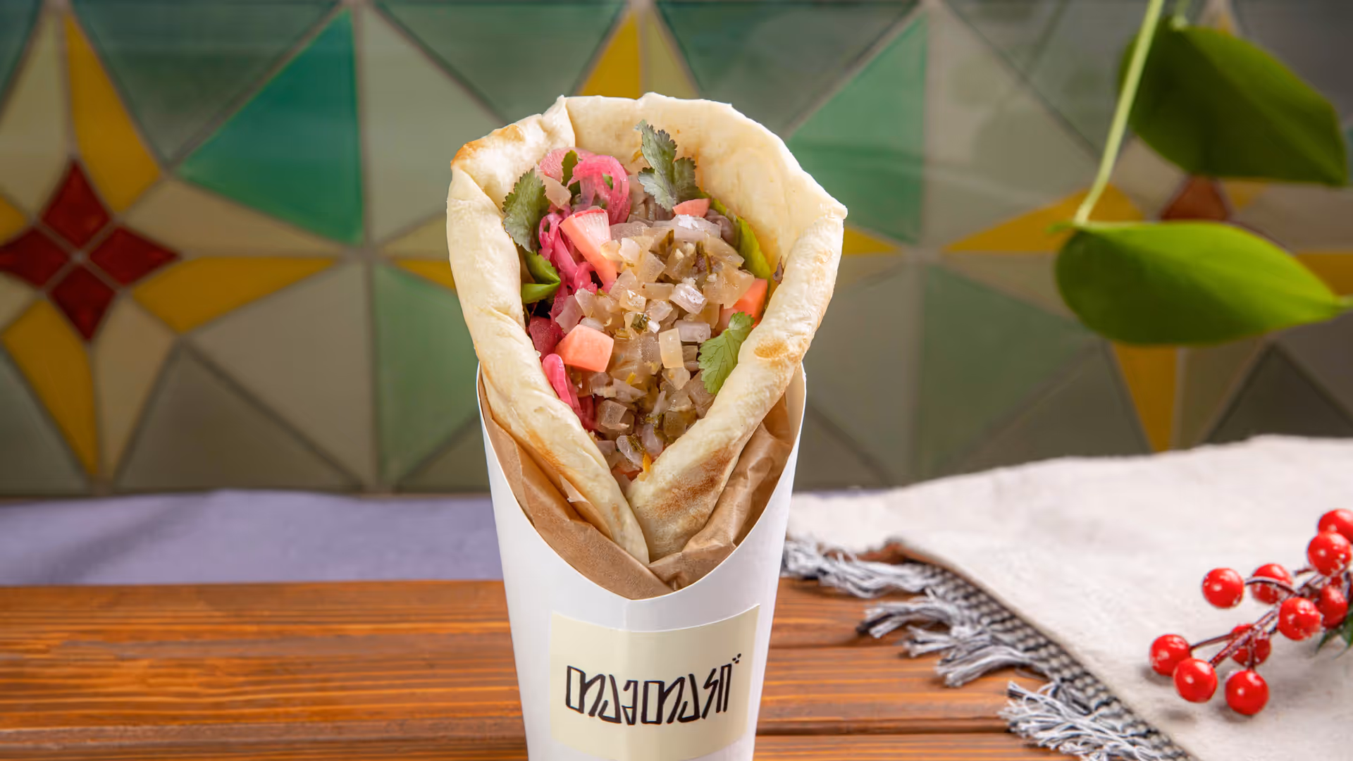 Refried beans wrapped in tamtaki bread, sour green tomato salsa, sour red onion, sour radish, arugula, coriander.