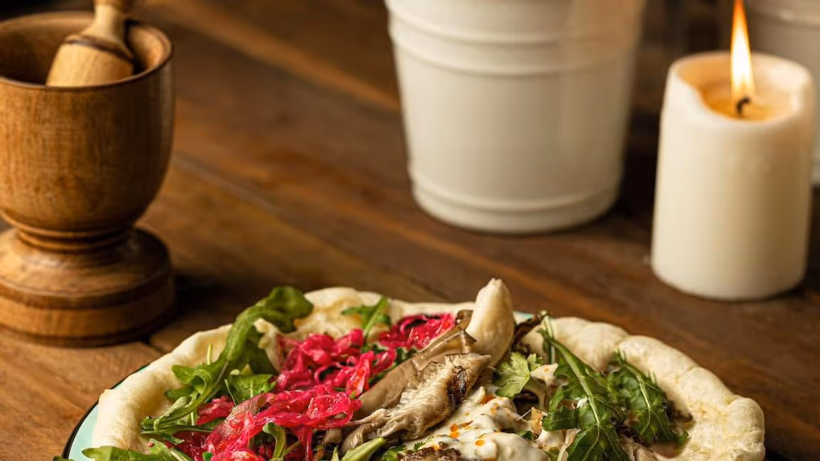 Grilled, smoked wood mushrooms wrapped in tamtaki bread, smoked suluguni and mozzarella sauce with red pepper oil, pickled red onion, arugula, coriander.